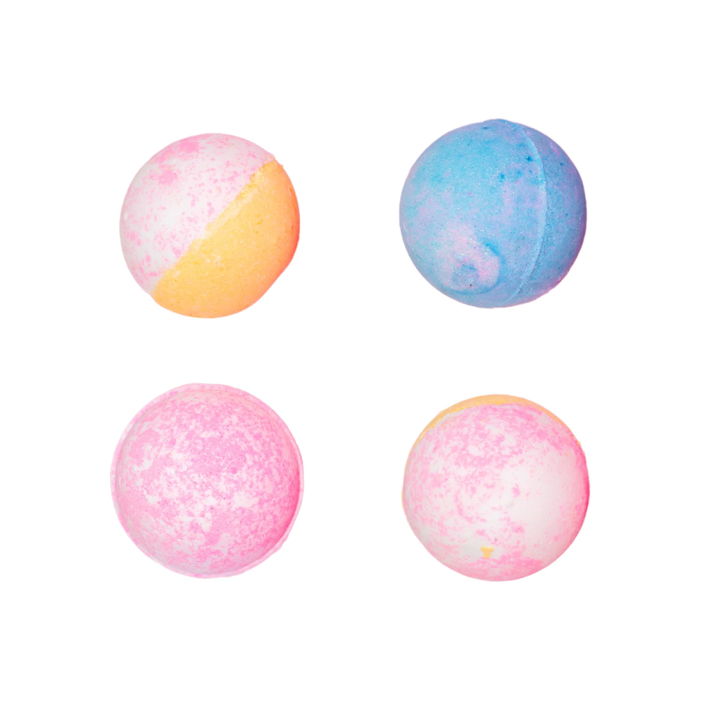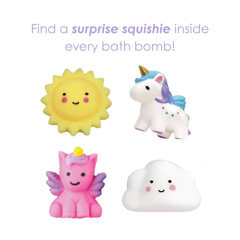 Nourishing, natural, extra-fizzy bath bombs! This 4pcs set of 5.5 oz bath bombs comes complete with 1 surprise squishie inside each bomb!