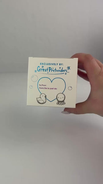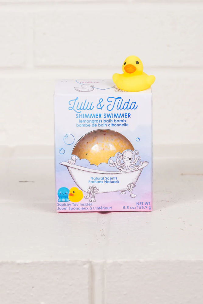 Make bath time an adventure with the Swimmer Shimmer Bath Bomb! This sunny yellow, lemongrass-scented bath bomb fizzes with nourishing, natural ingredients and a touch of biodegradable sparkle. The best part? There's a surprise waiting inside—a playful turquoise octopus squishy or a classic rubber duckie squishy! Safe, fun, and FDA-tested, it's the perfect blend of relaxation and excitement for your little one.