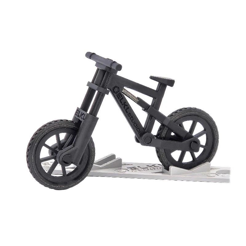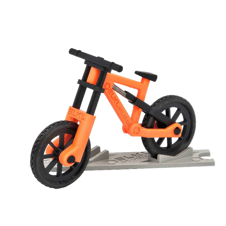 The ELKL Studios n+2 Downhill Finger Bike offers a plush spring-loaded front suspension dual-crown fork, as well as rear suspension for the softest landings or for flying through the bumpiest terrain. ELKL Studios' line of finger bikes and accessories are proprietary designs representing hundreds and hundreds of hours of engineering.