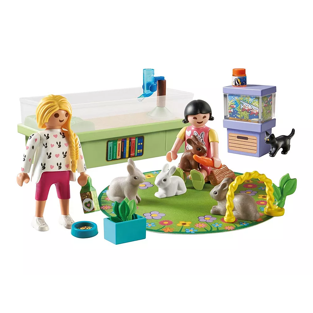 Lively details for creative play The PLAYMOBIL Family with Rabbits set includes everything young animal lovers need. The cozy enclosure and play mat invite kids to engage with the rabbits, while the colorful aquarium provides variety and charm. With a food box and easy-to-carry bag, children can transport accessories and provide fresh food for their furry friends. This set is perfect for creating imaginative stories and heartwarming play scenes.