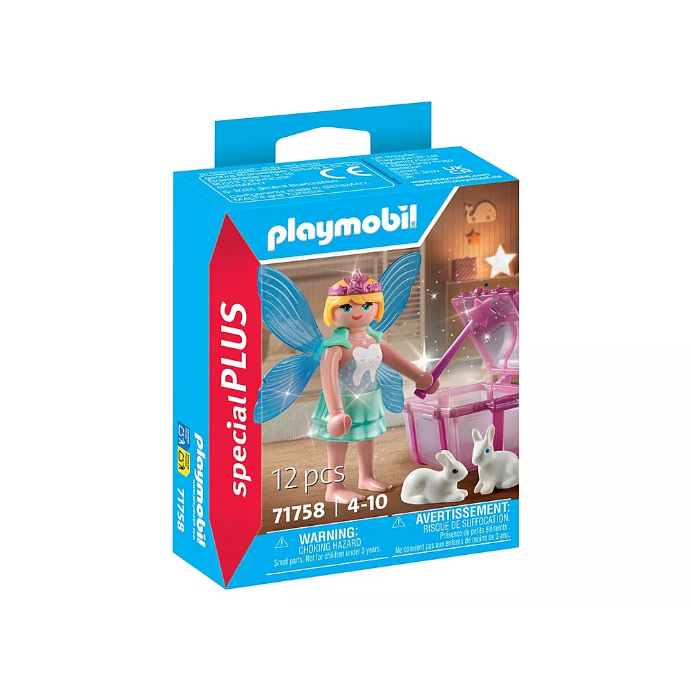 PLAYMOBIL Special Plus Tooth Fairy with magic wand, treasure chest, and two rabbits. On her nightly visit, the friendly fairy is accompanied by two cute companions. The small chest provides ample space for storing your milk teeth.