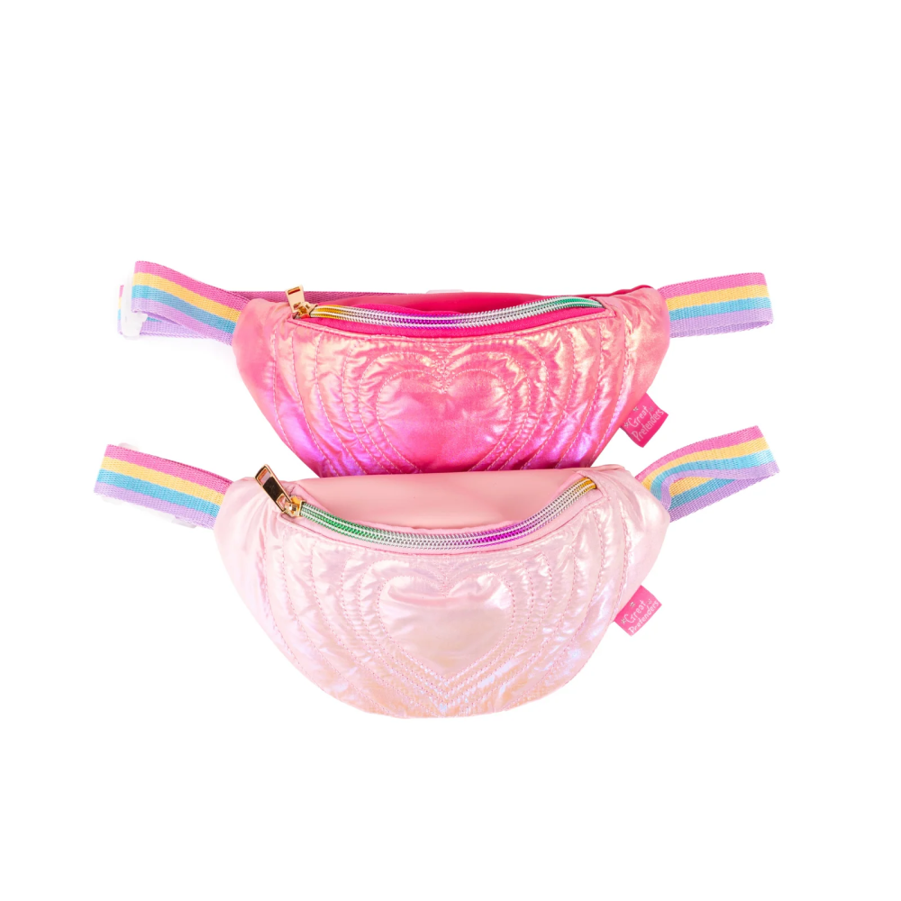 Spread sparkle wherever you go with our Heartstrings Puffy Fanny Pack! This adorable iridescent pink belt bag features stitched puffy hearts all over, giving it a cute, texture that shines in every light. The rainbow strap adds a burst of colour and makes it easy to wear hands free, perfect for carrying little essentials during playdays, parties, and every colourful adventure ahead!