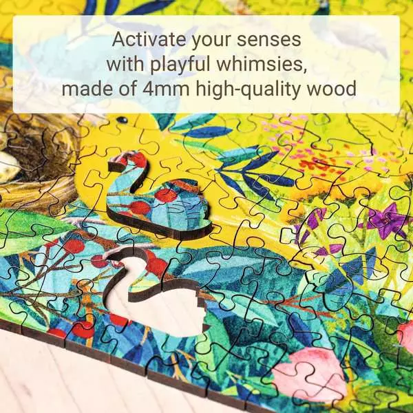 Made by expert designers, 40 of our wooden jigsaw pieces come in unique and delightful shapes like birds, bunnies, bugs and more! The interlocking pieces feel smooth to the touch and are made of premium wood with a natural, outdoorsy scent. The image is printed directly on the wooden material (not on paper) so there’s no chance of it peeling or colors fading over time. The sturdy pieces are just over 1/8 inch (4mm) thick to ensure lots of long-lasting fun as you make this delightful puzzle over and over again!