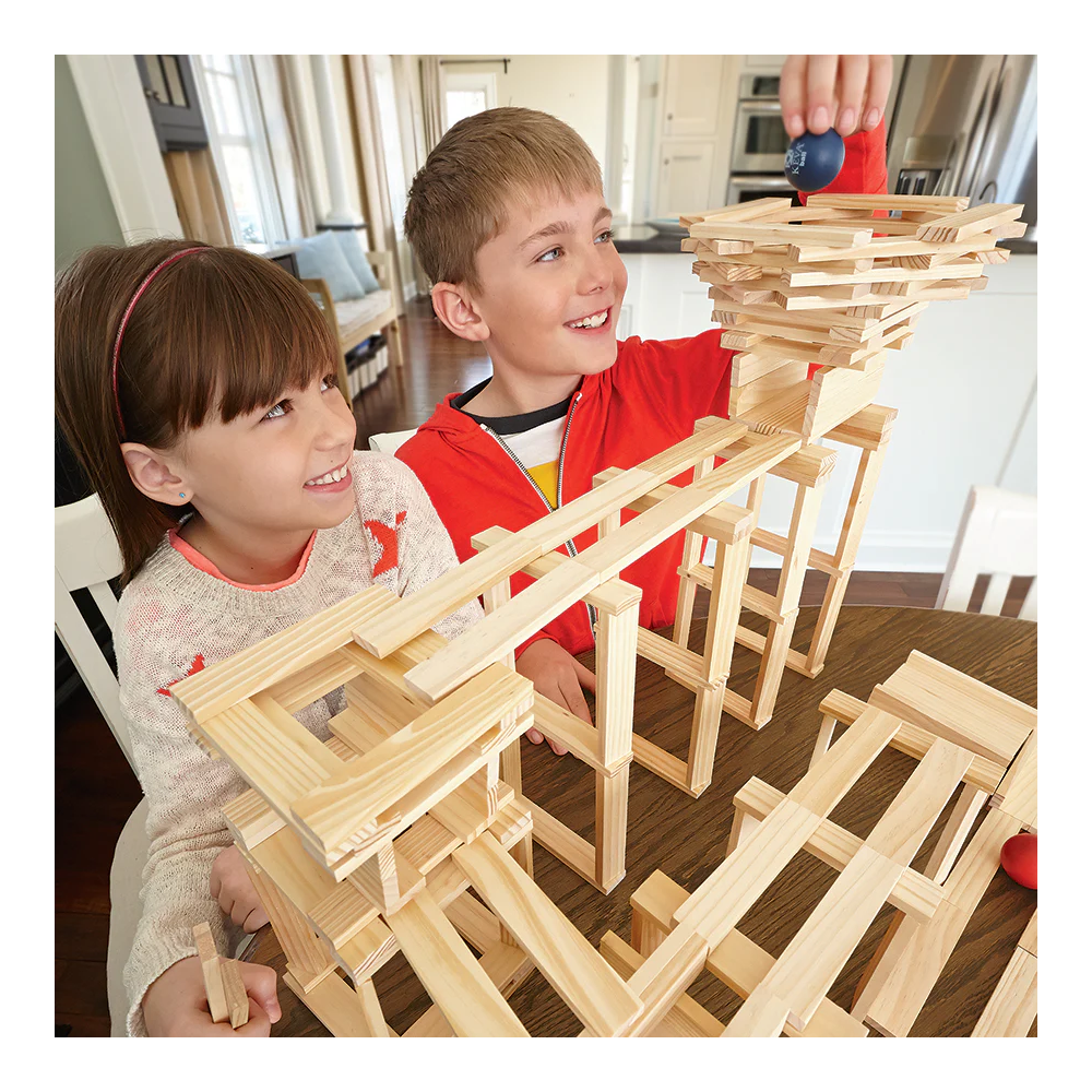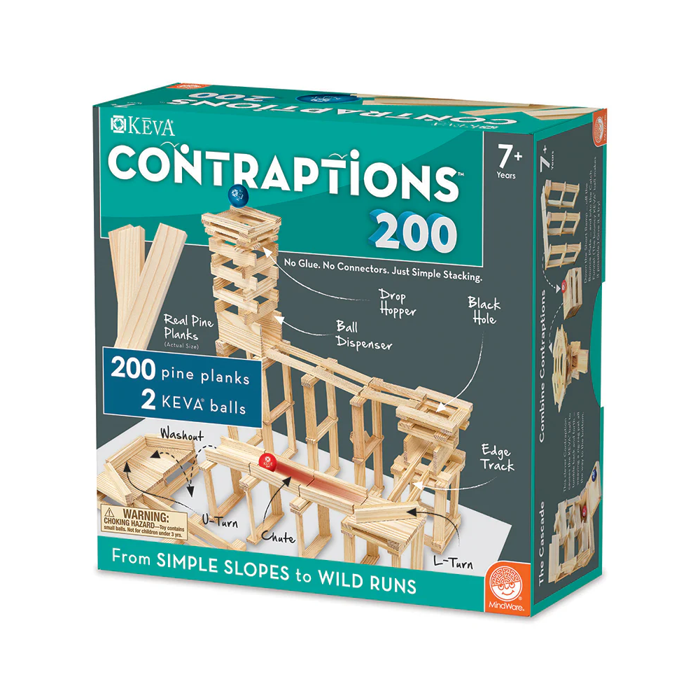 Young thinkers can build unbelievable ball track structures with this simple stacking plank set. Create ramps, funnels, chutes and crazy contraptions like the "Black Hole" and "Bounce Plate." Then find out if the ball rolls as expected. No glue, no connectors: just loads of constructive fun! Includes:KEVA Contraptions 200-piece plank set contains 200 wooden planks, 2 specially-designed lightweight balls for maximum action and an 18-page idea book with project photos and quick-start instructions. • Basic building planks can be used to build endless configurations• Fosters creativity, experimentation and STEM education• Builds an early understanding of proportion, balance and basics of physics & engineering• Planks are made from solid, unfinished pine
