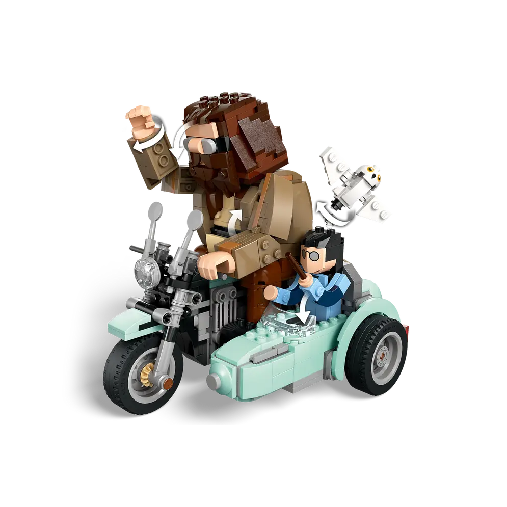 - 3 brick-built LEGO® Harry Potter™ characters – The model features built-in, posable Harry Potter, Hedwig™ and Rubeus Hagrid™ toy figures riding on Hagrid’s flying motorbike and sidecar