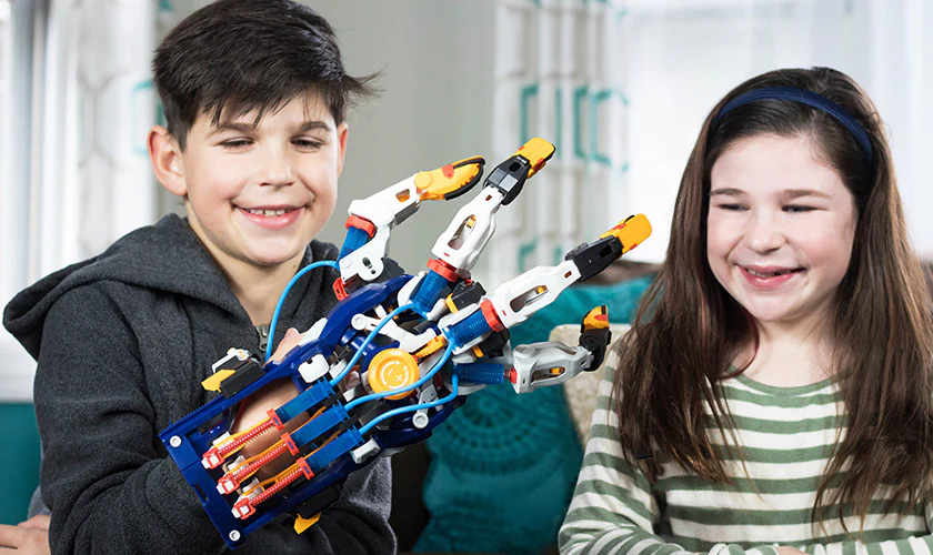 Once assembled, your cyborg hand slips onto your own hand like a glove, with mechanical fingers that you operate with your own fingers and that can grip objects with enough force to lift them. Challenge yourself to pick up and hold a variety of items like bottles, pencils, small items--anything with reach!