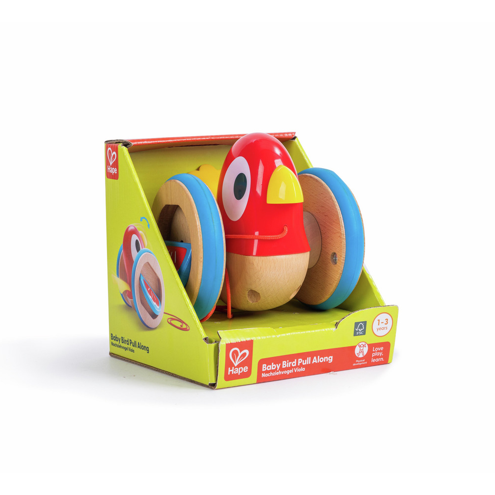 Baby bird can’t fly yet, but she loves to stand on her own and take small steps forward! Use the cord to pull her and she wobbles and flaps her wings.