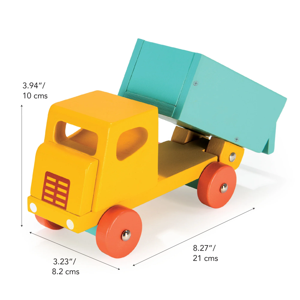 Based on a retro design, the simple clean lines give this traditional toy a refreshing look and feel. A classic big yellow lorry with tipping back part and orange wheels.